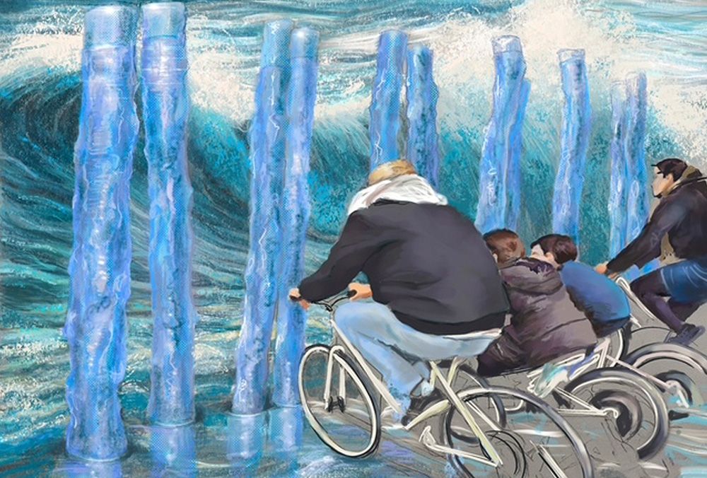 Une installation faite d’un écran géant en télés récupérées qui diffuse un film sur la furie des Océans et des flots avec des déferlantes de vagues qui viennent submerger 2 rangées de 12 brise-lames imprimés 3D en plastique translucide 100% recyclé et 100% recyclable qui se remplissent d’une eau teintée de pigments naturels bleue évoquant l’élévation inexorable des niveaux de la Mer et des Océans et protégent une batterie de vélo où le public était invité à venir pédaler pour s’opposer à la montée de l’eau dans les brise-lames.