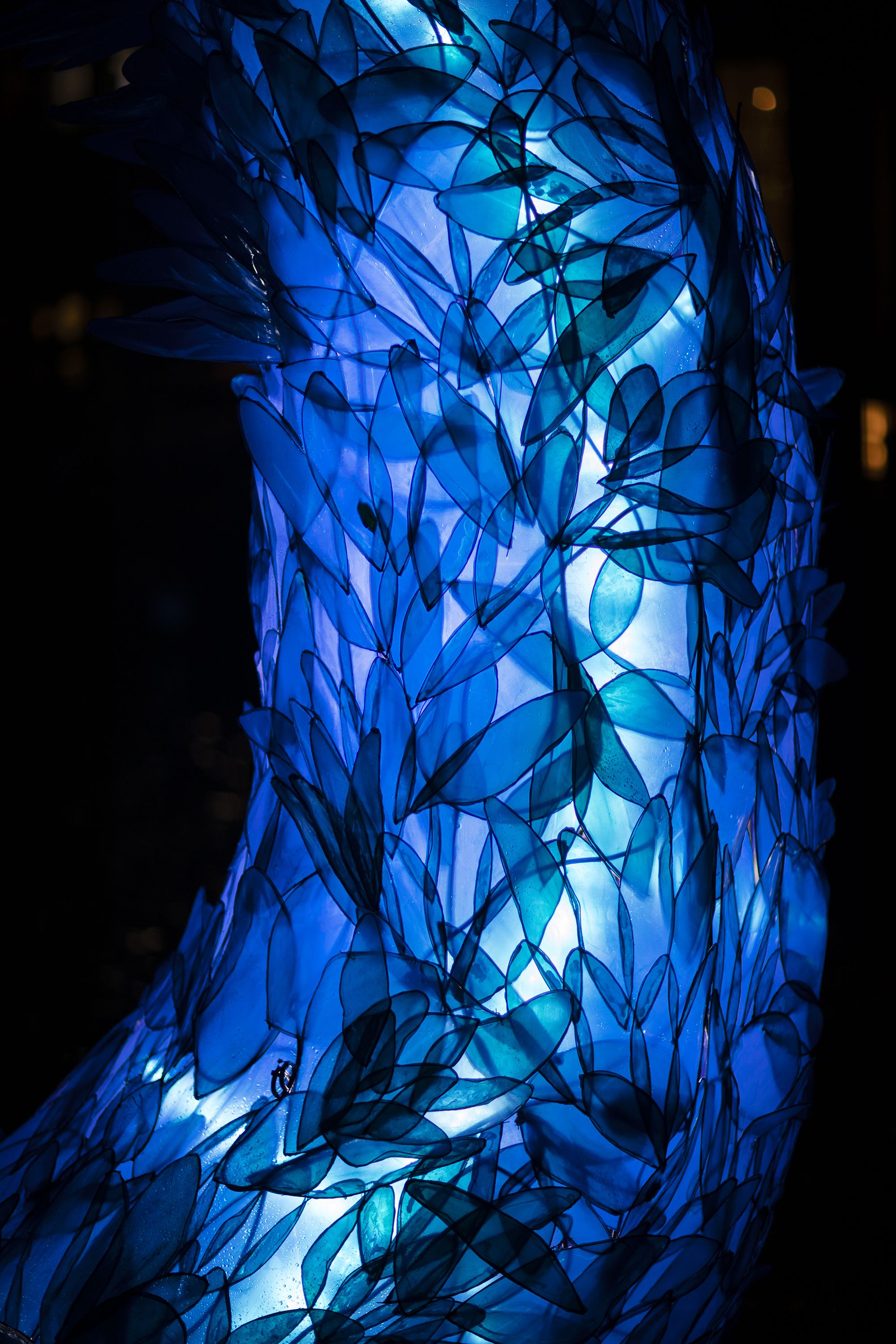 Chaque écaille qui constitue cette sculpture a été faite à la main, individuellement. Le plastique utilisé a été recyclé à partir d'anciennes installations de l'artiste.